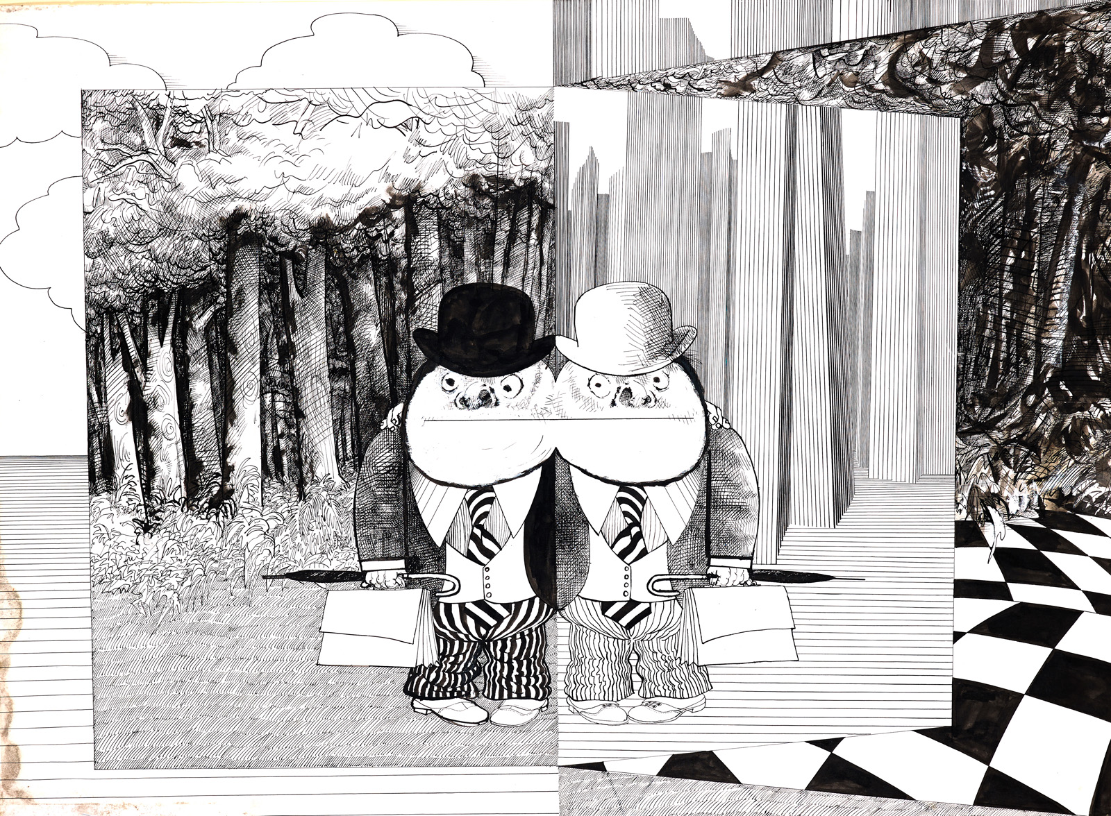 Once again transposing modern stereotypes into the fantastical world, Tweedle Dee and Tweedle Dum become nonsensical bankers and the White Knight has the face of Lewis Carroll himself. Steadman takes the reader firmly into this harsh new world of hippies and new age romantics all set against the unforgiving chess board background while producing some of his  most elegant works.