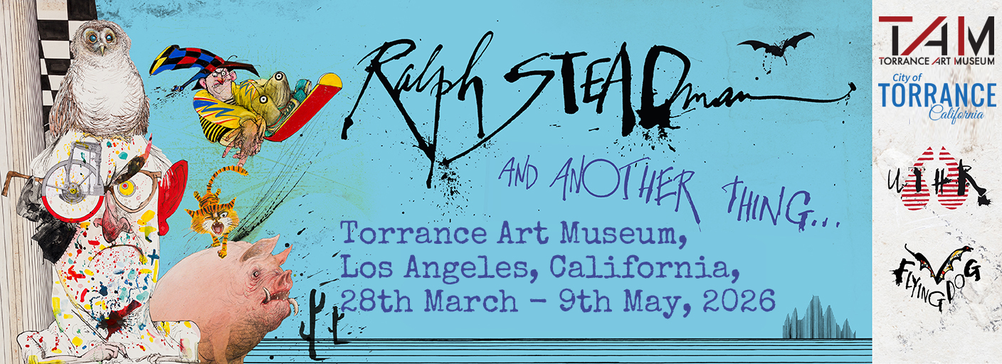 Join us on the evening of Monday, March 30th at 7pm, at the famed Book Soup in Los Angeles to get your Ralph Steadman and Another Thing exhibition catalogue. This full-color 210-page hardcover or softcover book, which highlights over 65 years of Ralph’s creative contribution and artworks featured from March 28th through May 9th, 2026, at the Torrance Art Museum. The And Another Thing exhibition catalogue can be exclusively purchased on the Book Soup website.