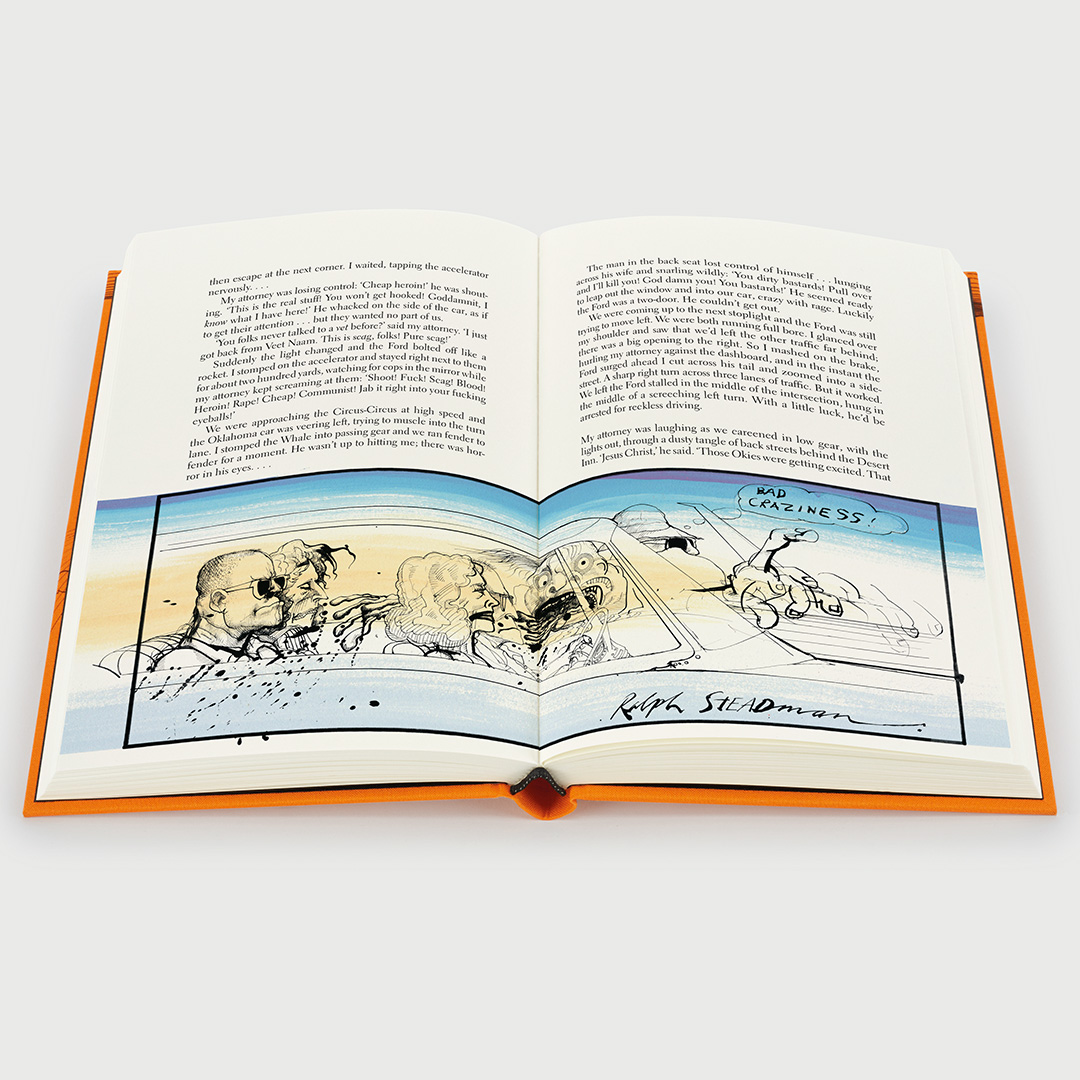 Hunter S. Thompson’s acid-laced counterculture classic, Fear and Loathing in Las Vegas, is given the ultimate collector’s makeover in this 50th anniversary Folio Society edition featuring Ralph Steadman’s original illustrations and an exclusive introduction by David Mamet. Alongside Thompson’s biting text, Steadman’s iconic illustrations have been given a new lease of life in the all colour edition.